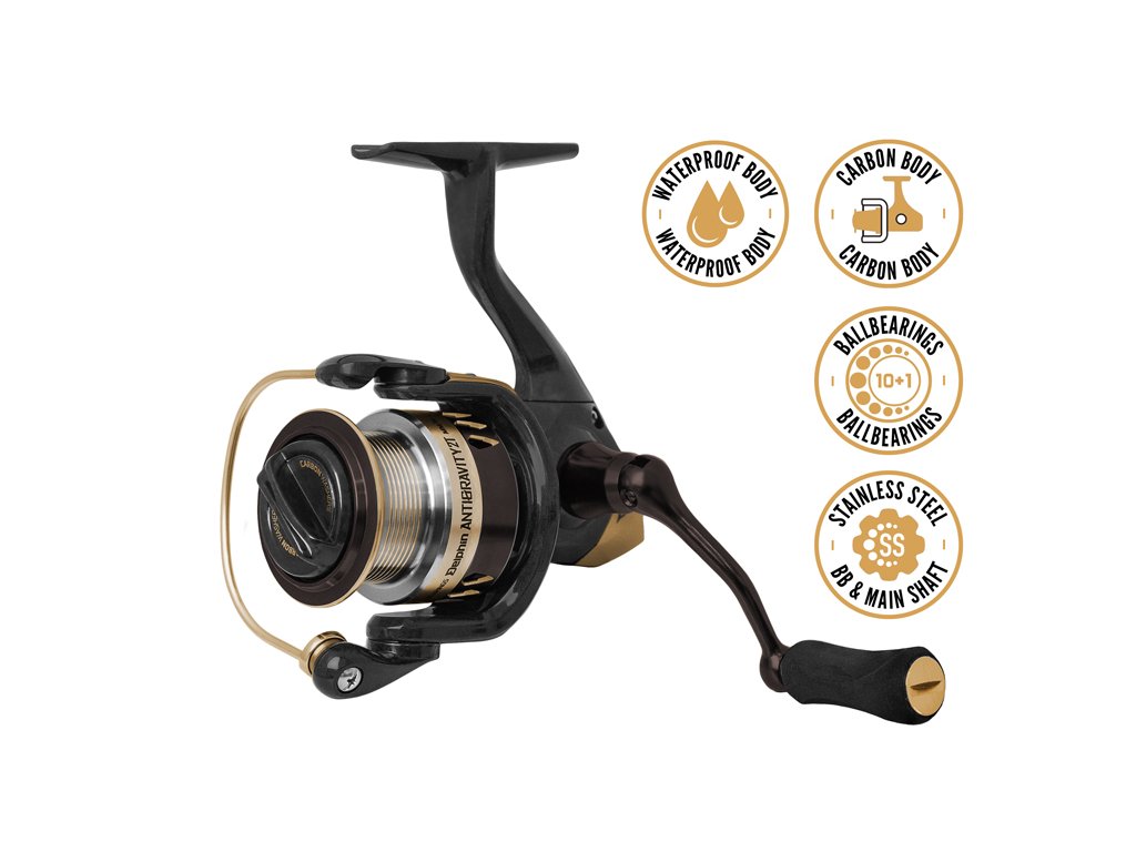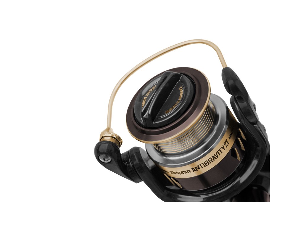 Delphin ANTIGRAVITY je ultra lehký naviják prémiové kvality, se kterým si přijdou na své i nároční rybáři. O extra nízkou hmotnost se stará karbonové tělo s odlehčenou kovovou cívkou. Svou kompaktní velikostí je ANTIGRAVITY ideálním společníkem při přívlači, ale určitě se neztratí ani při lovu na splávek či při jemném feederu. Uvnitř těla je ukryt precizně zpracovaný mechanismus s převodovým poměrem 5.2:1, který se spolu se soustavou až 10+1 kuličkových ložisek, stará o velmi jemný chod. Všechna ložiska jsou navíc vyrobena z nerezavějící oceli, čímž je značně prodloužena životnost navijáku, ke které nemalou měrou přispívá také absolutní voděodolnost těla. Kovová klika má vlastní závit a upevňuje se do těla našroubováním do vnitřní matice, čímž dochází k minimalizaci jakýchkoli vůlí. K mimořádně pohodlnému uchopení kliky slouží madlo vyhotovené z příjemné a měkké EVA pěny. Přední brzda s karbonovými podložkami umožňuje dokonalé dávkování brzdné síly podle potřeby. Mělká odlehčená cívka s odhozovou hranou umožňuje přesné hody. Ke všem velikostem navijáku ANTIGRAVITY lze podle potřeby dokoupit náhradní hliníkovou cívku.