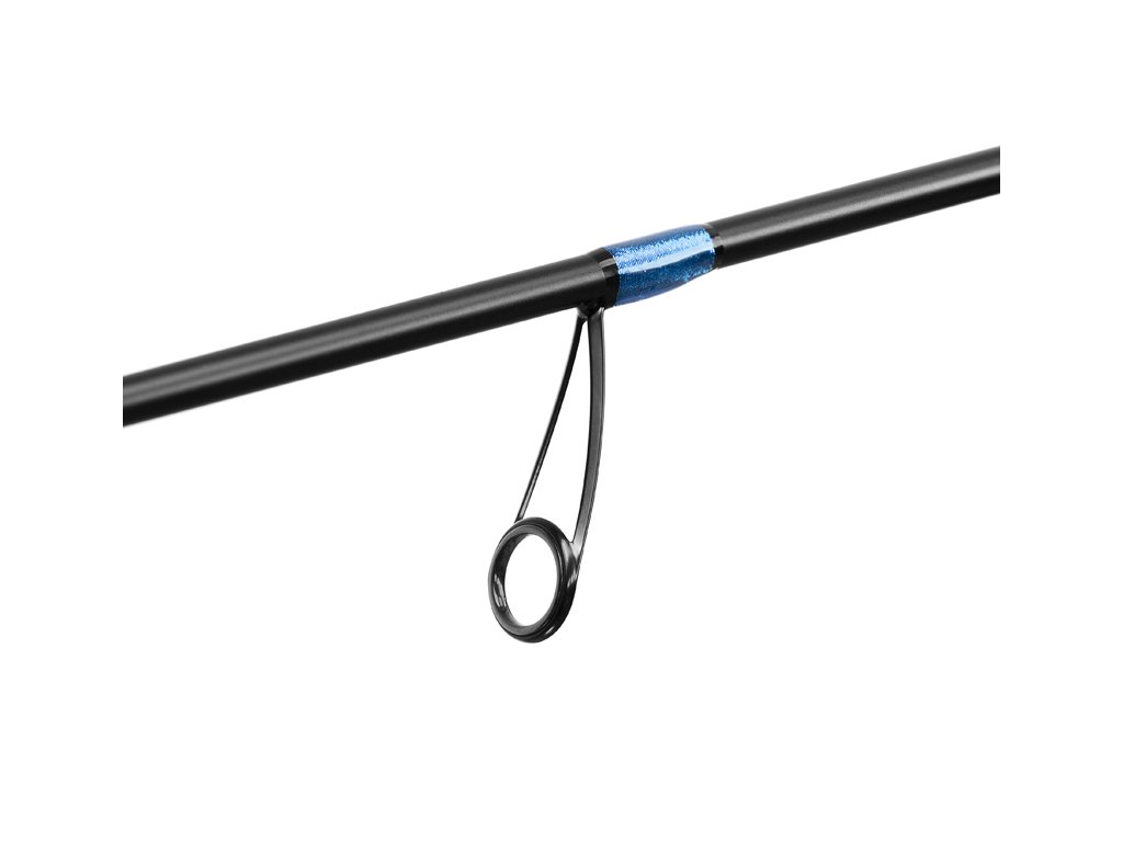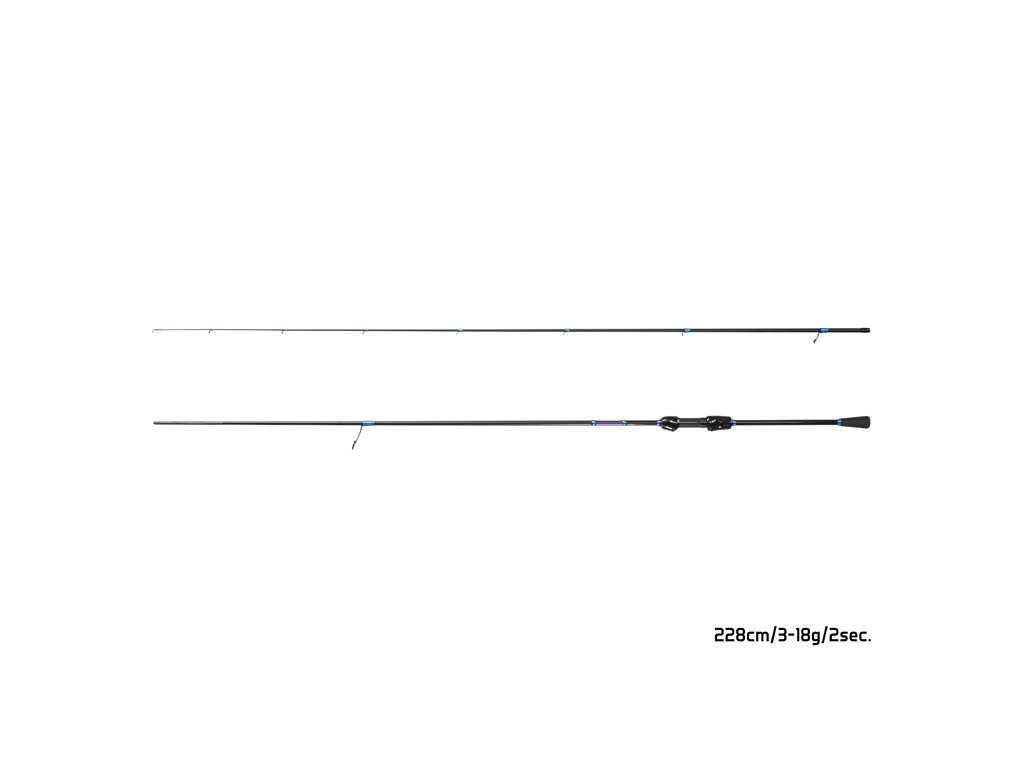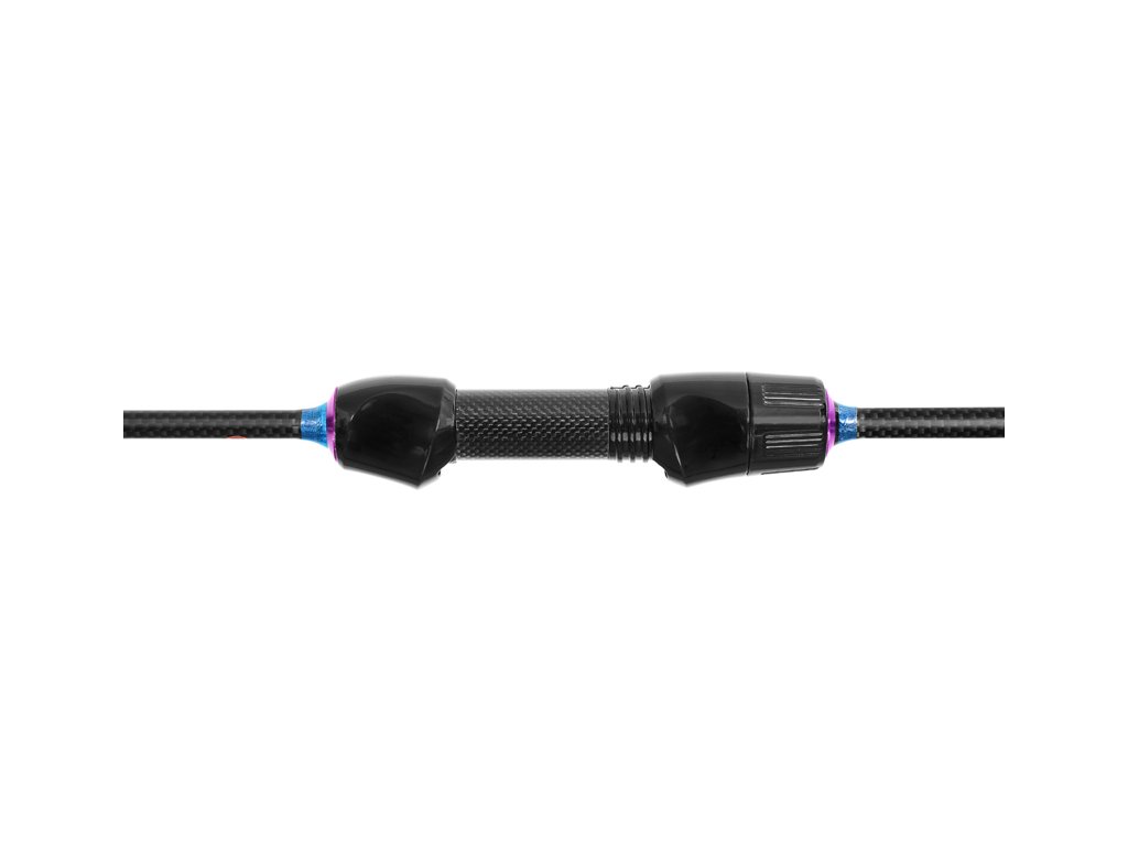 Sedlo prutu je velmi lehké a díky ergonomickému tvaru se skvěle drží v ruce. Po celé délce jsme použili jednostopková očka s modrým metalickým vinutím, která jsou rozmístěna tak, aby zaručovala rovnoměrné rozmístění síly a optimální vyvážení prutu. Povrchová úprava je matná, doplněná lesklým povrchem na rukojeti s efektním 3K karbonovým motivem.