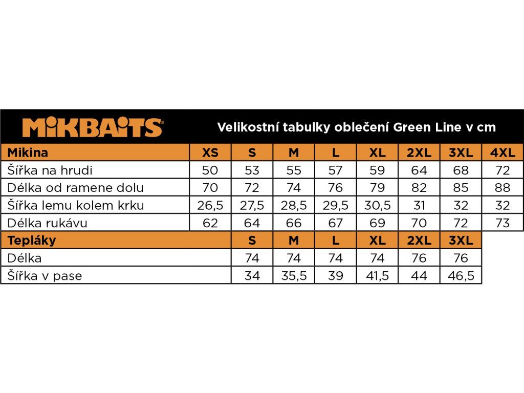 Kolekce oblečení Mikbaits Green line zahrnuje vedle mikin i kraťasy a tepláky. Jsou z velmi příjemného pohodlného materiálu, mají elastické zakončení pasu i nohavic, dvě kapsy na zip po stranách a vzadu menší kapsu s logem. Podobně jsou řešeny i kraťasy. Vše ve velikosti M až 4XL.