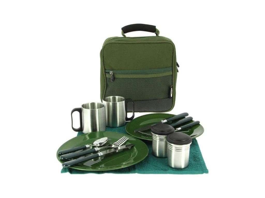 Set kvalitního jídelního příslušenství pro rybaření a kemping. Obsahuje utěrku, talíře z velmi odolného plastu, kompletní příbory, nerezové termohrnky a nerezové dózy na cukr a sůl. Vše je zabaleno v kvalitním polstrovaném pouzdru se zipem a transportním uchem.