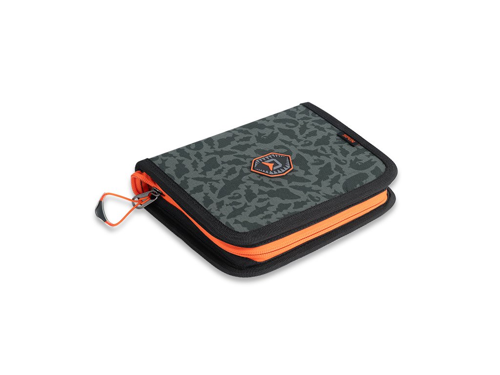Po úspěšném modelu Delphin ATAK! Spun jsme se rozhodli zařadit do naší nabídky novou verzi Darx ATAK! Spun. Jak již z názvu vyplývá, nová elegantní tmavá kamulfáž DARX zamezí rychlému zašpinění a stane se unikátním doplňkem rybářské výbavy. Praktické penálové pouzdro bylo navrženo speciálně pro odkládání různých umělých nástrah jako jsou plandavky, menší woblery nebo gumy připravené na jigech. Penál Spun ocení zejména vláčkaři, aby ochránili své TOP nástrahy. Vnitřek penálu je na obou stranách tvořen silnější vrstvou profilované EVA pěny, kde si může lovec odkládat své nejpoužívanější nástrahy a mít je ihned po ruce pro případ rychlé výměny. Jako prevenci proti zachytávání háčků nástrah o sebe jsme penál vybavili pevnou plastovou příčkou. Ocení ji nejen vyznavači velmi populárního lovu pstruhů na stojatých vodách, známým pod názvem Trout Area, ale také všichni ostatní rybáři, kteří se nebojí často měnit nástrahy, a tak vyprovokovat i pasivní rybu k záběru. Na kvalitní vnější zip oranžové barvy je připevněn plastový úchyt pro lepší manipulaci, který je na konci rozšířen, pro snadné a rychlé uchopení. Doplňky oranžové barvy umožňují rybáři rychleji spatřit pouzdro, a to i za šera, během časných ranních nebo pozdních večerních vycházek. Design tašky doplňuje naše jedinečná tmavá ATAK! kamufláž se siluetami dravců.