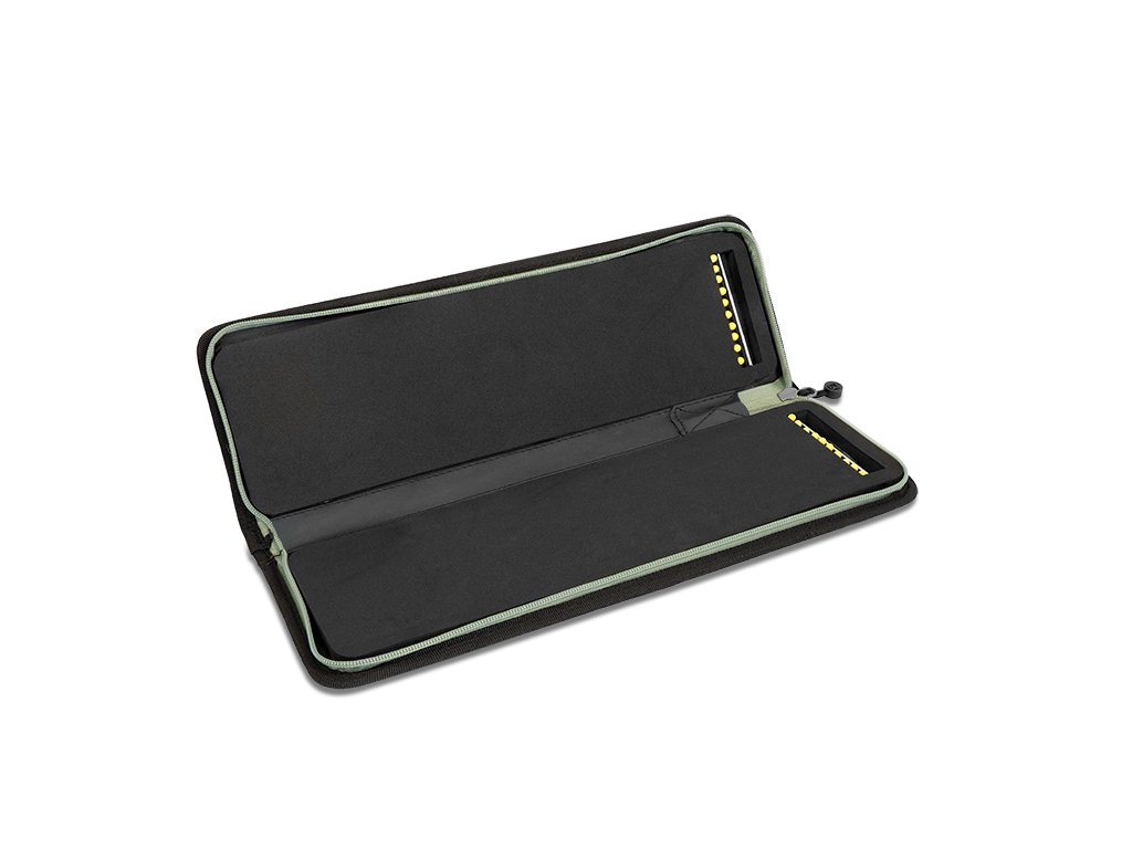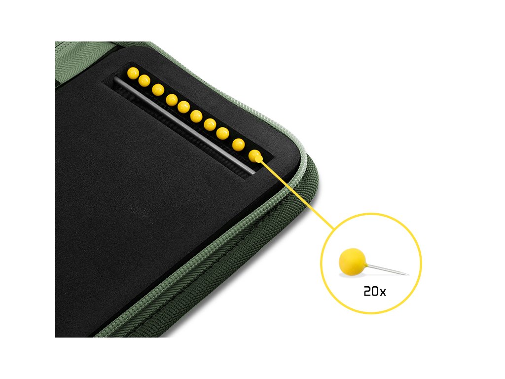 Delphin Rig LOONG SPACE C2G je nové prodloužené pouzdro, díky kterému přejdete na vyšší úroveň organizace a ochrany vašich dlouhých návazců. Díky tomuto pouzdru už nikdy nebudete ztrácet čas rozplétáním uzlů nebo zdlouhavým navazováním nových návazců u vody právě v době vysoké aktivity ryb. Jak již název napovídá, pouzdro je určeno k uložení připravených návazců až do délky 38cm, které budete mít vždy rovné a připravené k okamžitému použití! Pouzdro je jednoduché konstrukce a jeho vnitřek je tvořen odolným tvrzeným molitanem se dvěma výřezy. Ve výřezech se nacházejí ocelové tyčky pro zachycení návazcových háčků. Pro napnutí a uchycení návazců o molitan je pouzdro vybaveno 20 špendlíky, které umožňují mít vždy dostatečné množství připravených návazců, což ocení jak začínající rybáři, tak zkušení závodníci. Z vnější strany je pouzdro vyztužené a potažené odolným materiálem. Pouzdro je osazeno zipem s kovovým běžcem, na kterém je stylový držák s logem Delphin.