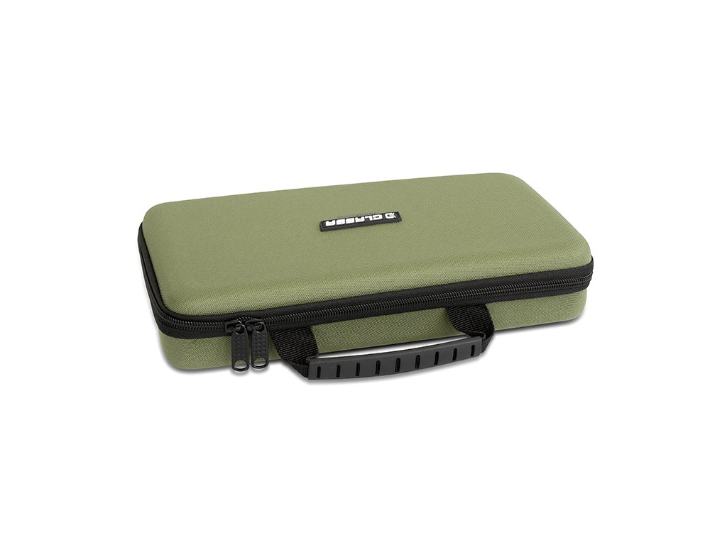 Je vyrobeno z odolného materiálu, potaženého nenápadnou tmavě zelenou tkaninou, takže taška si udržuje svůj tvar a v porovnání s běžnou látkovou taškou lépe odolává vnějším vlivům a nešetrnému zacházení. Kvalitní zip se dvěma běžci umožňuje zcela uzavření pouzdra. V přední části se nachází pogumované madlo, určené pro pohodlný přenos a vyjímání z větších tašek.