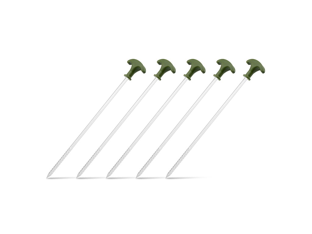 Set náhradních kolíků, pomocí kterého si můžete doplnit nebo nahradit své kolíky k bivaku, případně vylepšit slabší a tenčí typy k deštníkům nebo jiným menším přístřeškům. Disponují plně uzavřenými plastovými madly zelené barvy, jejichž výhodou je, že se ani po delší době zabíjení do země nezačnou uvolňovat a sesouvat po kovové tyčce směrem dolů. Vrták s odolným čtyřhranným hrotem napomáhá snadnějšímu zapíchnutí do tvrdé a suché půdy. Hroty jsou při koupi opatřeny transparentními ochrannými krytkami pro zvýšení bezpečnosti.