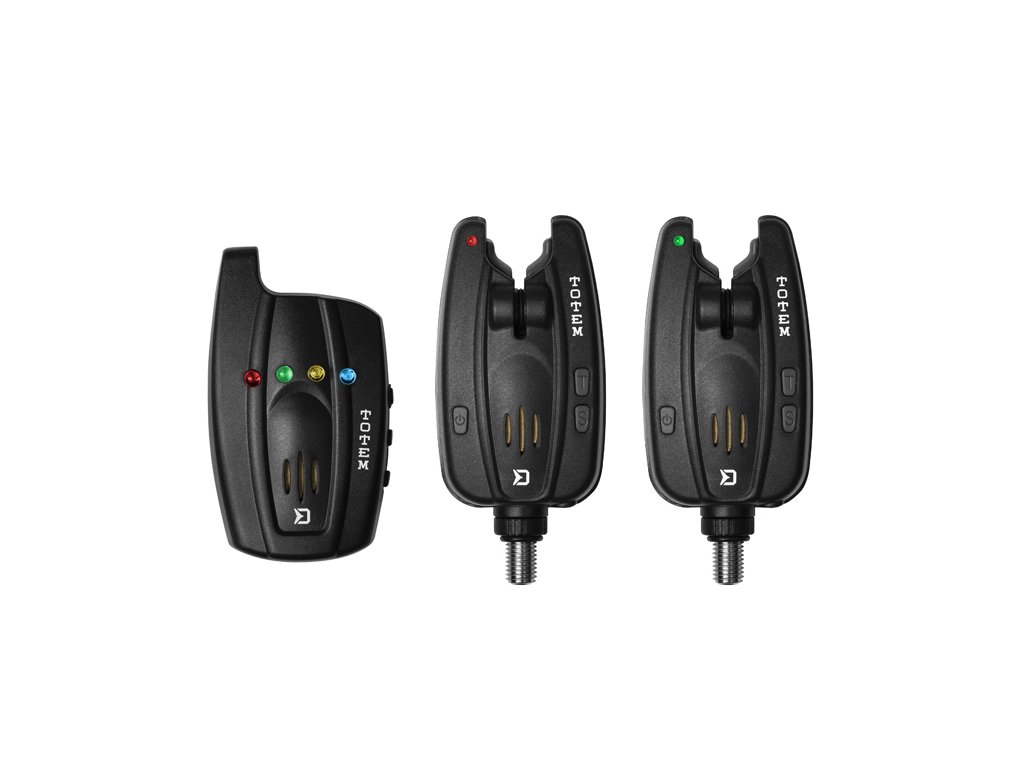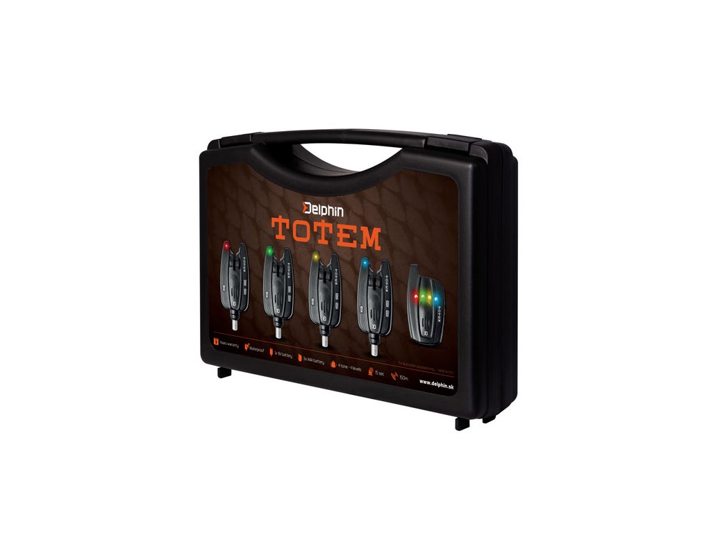 Extrémně kompaktní rozměry signalizátoru a přijímače v ergonomickém tvaru. Delphin TOTEM nabízí naprostou voděodolnost signalizátoru a přijímač se skvělým dosahem až 150m v závislosti na okolních podmínkách. Signalizátor má ultra jasnou LED diodu s velmi dlouhou výdrží. Je napájen 9V baterií což zajišťuje jeho dlouhou dobu provozu. Dobrou vychytávkou je alarm, který krátkým pípnutím a svícením LED diod upozorní na snížení stavu kapacity baterie pod 5V (také pípne i přijímač). TOTEM nabízí možnost otestování všech jeho funkcí. Má 4 úrovně hlasitosti včetně tichého režimu, 4 různé tóny a 4 úrovně citlivosti. Ve tmě zajisté oceníte možnost zapnutí noční diody. Vstup pro 2,5mm jack umožňuje připojení svítícího signalizátoru záběru. Hrubé pogumování v části kontaktu prutu se signalizátorem zamezuje poškození prutu. Signalizátor po záběru svítí 15 sekund (také přijímač). Přijímač je napájen 3 kusy AAA baterií. Na zadní straně má umístěn odepínatelný klip pro upevnění například za opasek. Samozřejmostí je tvrdý transportní kufřík pro bezpečný transport a ochranu sady mimo sezónu, tento kufřík pojme sadu až do konfigurace 4+1. Přijímač má 5 úrovní hlasitosti včetně tichého módu a možnost nastavení 4 úrovní tónu. TOTEM je kvalitní signalizátor se všemi funkcemi, které využijete při rybaření. Noční LED dioda, voděodolný alarm i přijímač či test funkce s upozorněním na slabé baterie. To je jen pár výjimečných funkcí signalizátoru Delphin TOTEM.