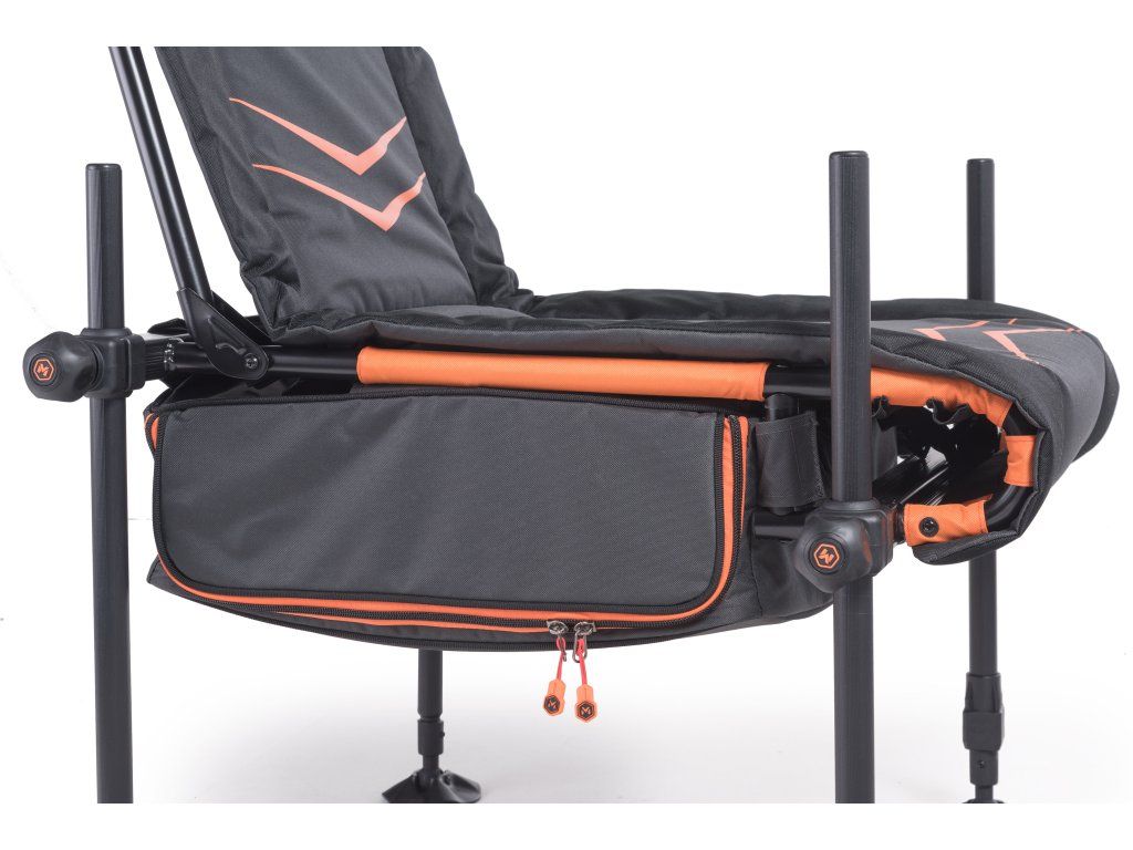 Pohodlná, dokonale stabilní a snadno přenosná. To je sedačka Feeder station TMX. Ergonomický design sedáku i opěradla spolu s kvalitně polstrovanou matrací zajišťují pohodlné sezení. Čtyři nastavitelné nohy se přizpůsobí všem nerovnostem terénu a spolu s vestavěnou libelou umožňují rychlé ustavení sedačky do roviny. Na strmých březích oceníte přední teleskopické nohy i kvalitní výkyvné patky proti zaboření. Sedačka je vybavena velkým úložným prostorem pod sedákem. Zde můžete uložit boční plata, držáky a další příslušenství. Nohy sedačky během transportu vsunete do připravených úchytů v zaoblené přední části sedáku. Opěradlo při přenášení sedačky jednoduše sklopíte a zajistíte ve sklopené poloze pomocí připravené spony. Součástí sedačky je i nastavitelný popruh pro nošení přes rameno.