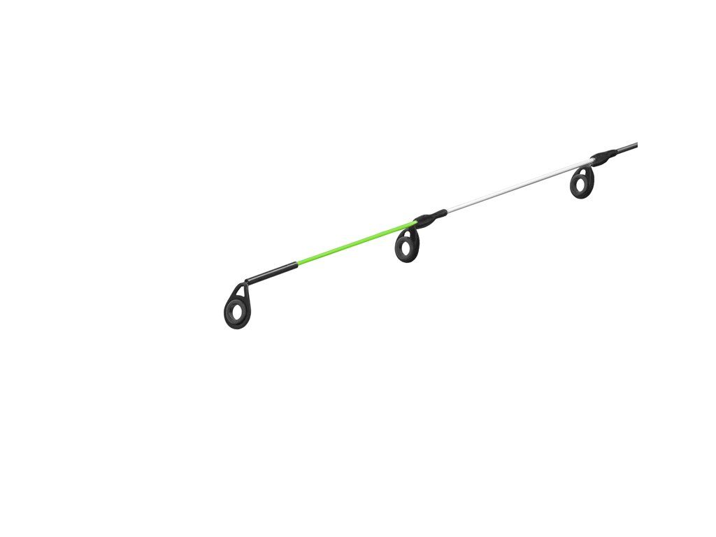 Blank prutu je osazen přetvarovanými, dvoustopkovými očky se SIC výplní, které excelentně vedou vlasec či šňůru a zároveň zamezují jejich zamotání během nahazování. Díky jejich černé barvě vytvářejí spolu s matným blankem a korkem na rukojeti vyladěný sportovně-elegantní design, doplněný o svěží, bílo zelené prvky.