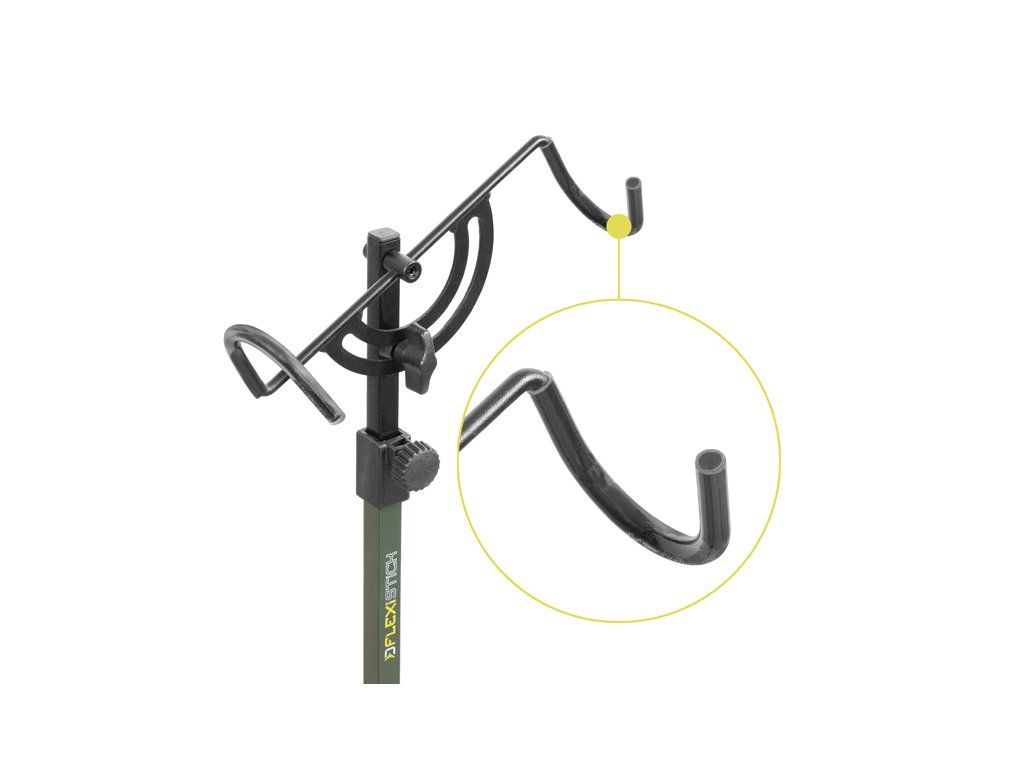 Vrchní část držící prut je vyformována z hrubého a pevného drátu černé barvy, který je specificky zahnutý tak, aby do něj bylo možné zasunout jakýkoli rybářský prut. Přední i zadní zahnutí je navíc potaženo gumou, což zamezí posouvání a zabrání poškození prutu. Držák je také polohovatelný pomocí kyvadlového mechanismu, takže si jej můžete nastavit do různých úhlů, ať už špičkou ke hladině, vodorovně nebo téměř kolmo vzhůru.