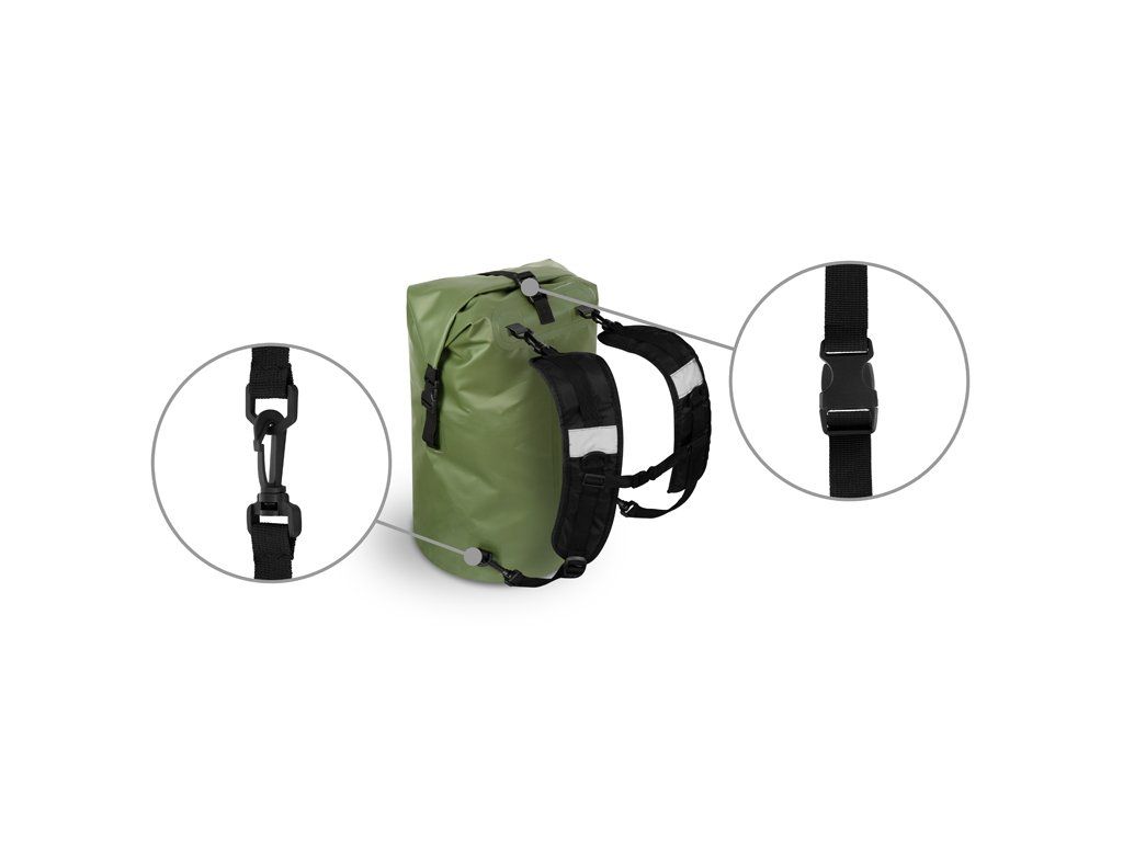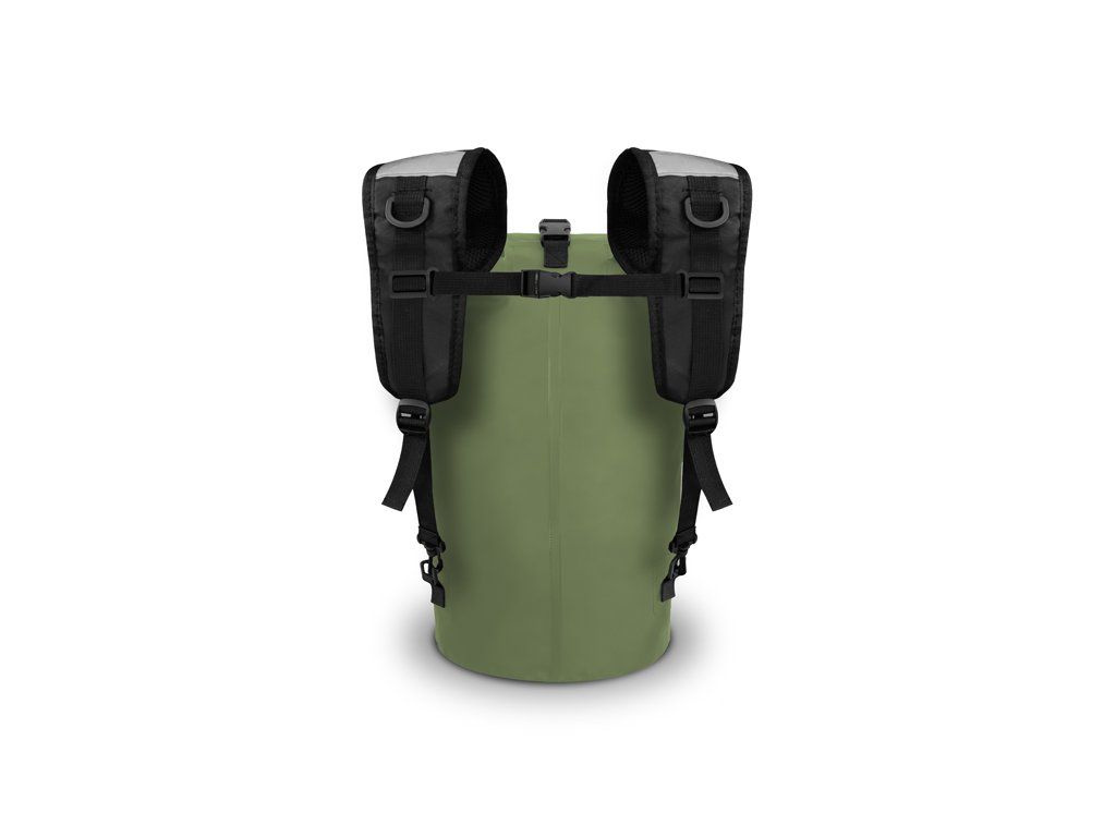Zavírání batohu je zajištěno pomocí pevného popruhu se dvěma klipy na vrchu batohu, který si v rychlosti několikrát zarolujete a klipy zapnete o jejich druhou polovinu přichycenou na tašce. Pro dodatečné zajištění po uzavření slouží další plastový klip v horní části. Pro snadný a rychlý transport bylo přidáno praktické gumové držadlo a ramenní popruhy disponující sponami, pro uchycení na obou koncích, díky kterým je lze kdykoliv odebrat. Popruhy jsou dostatečně polstrované a z vnitřní strany jsme použili perforovanou tkaninu umožňující zlepšené odvětrávání během nošení. Jsou také nastavitelné, doplněné o plastový klip pro jejich vzájemné spojení a dvě odrazky pro zvýšení viditelnosti.